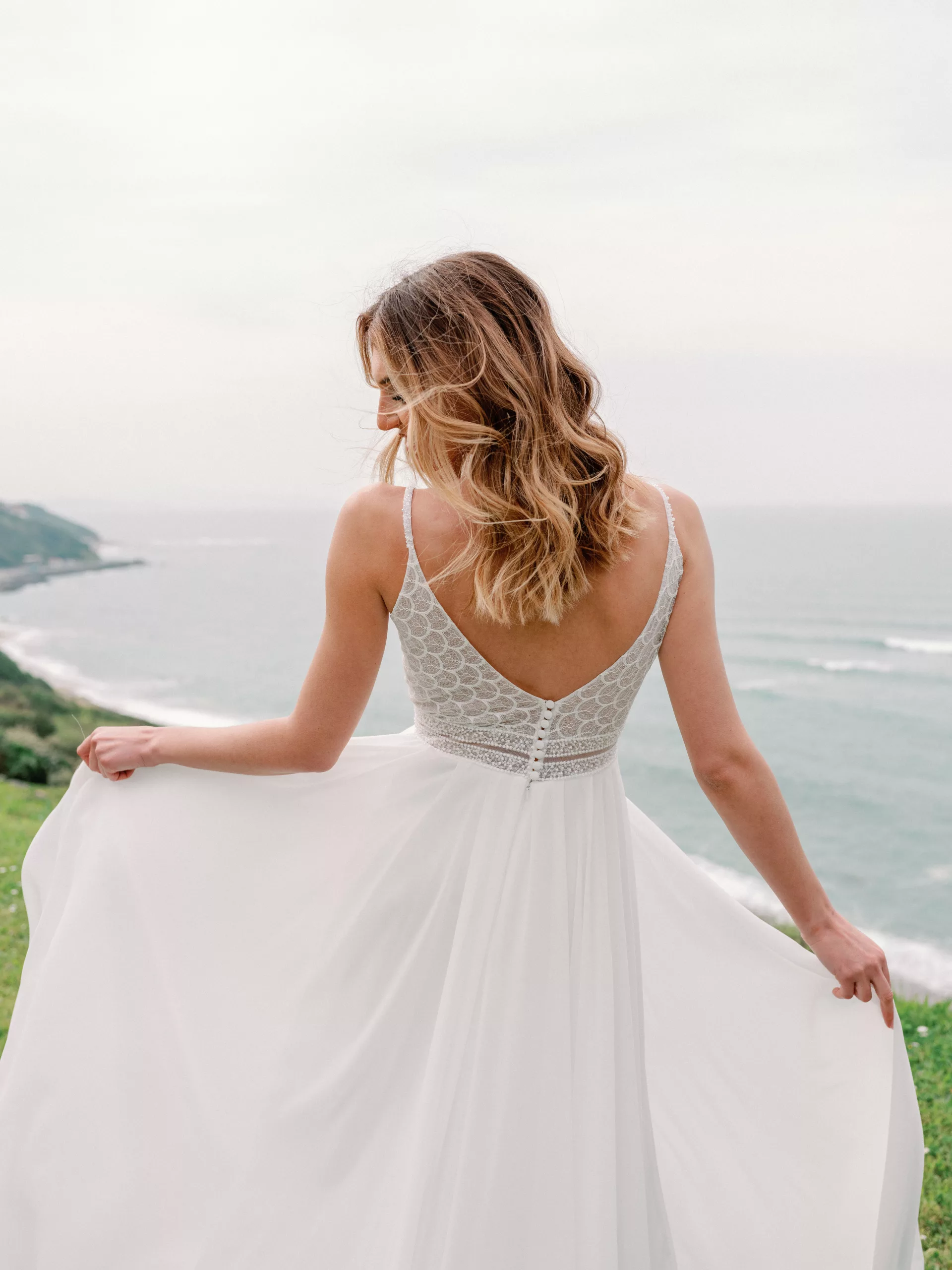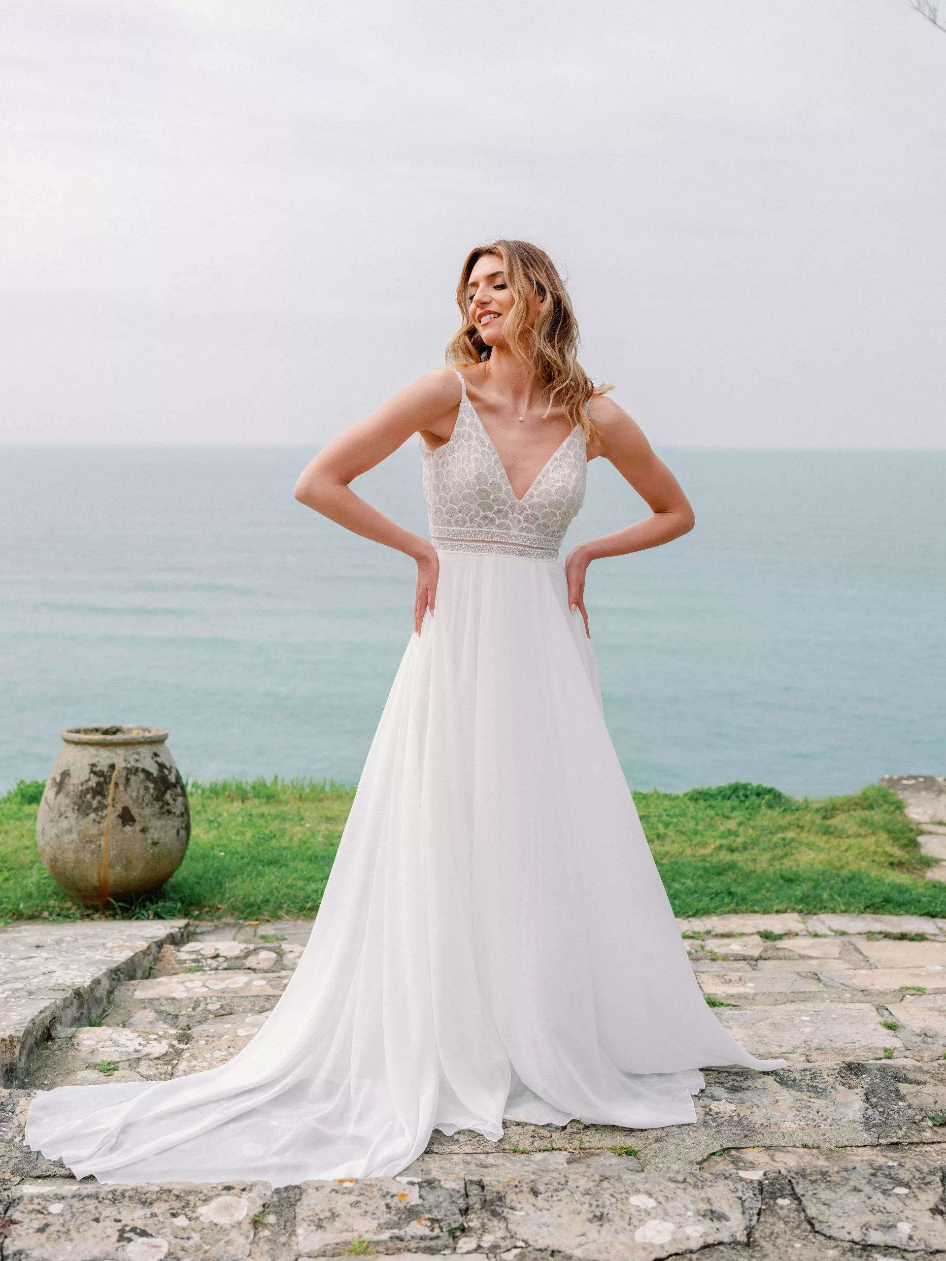 Superbe robe de la collection Angeola! Celle-ci se compose d’une dentelle légèrement brillante pour son top et de voile pour sa jupe. Cette robe magnifique peut également se porter avec une petite manchette. Cette pépite est de fabrication française.