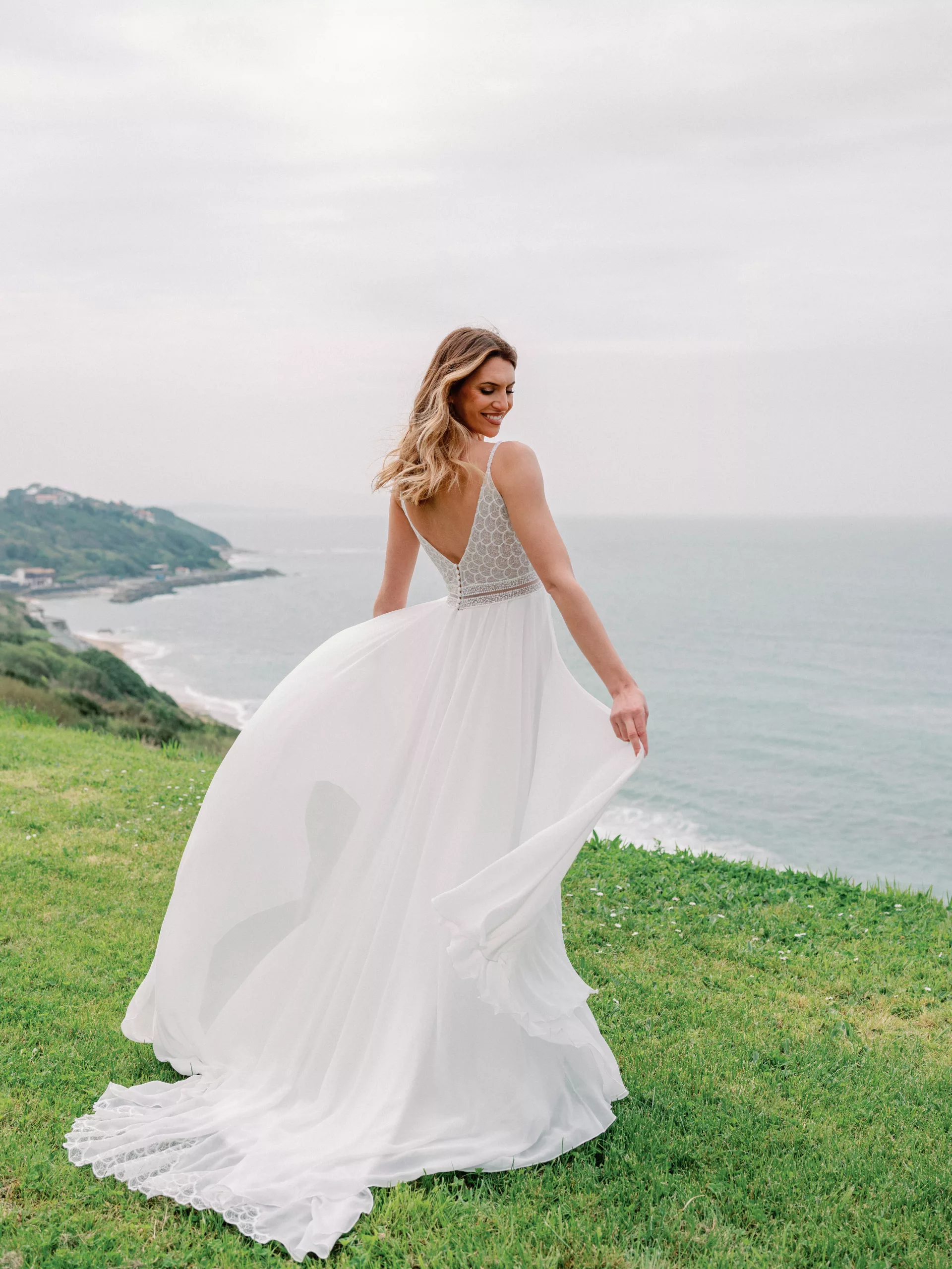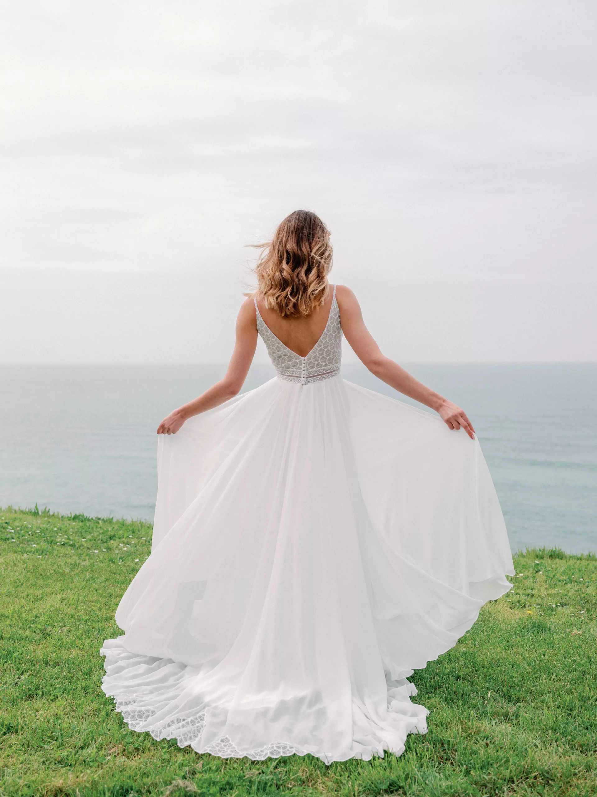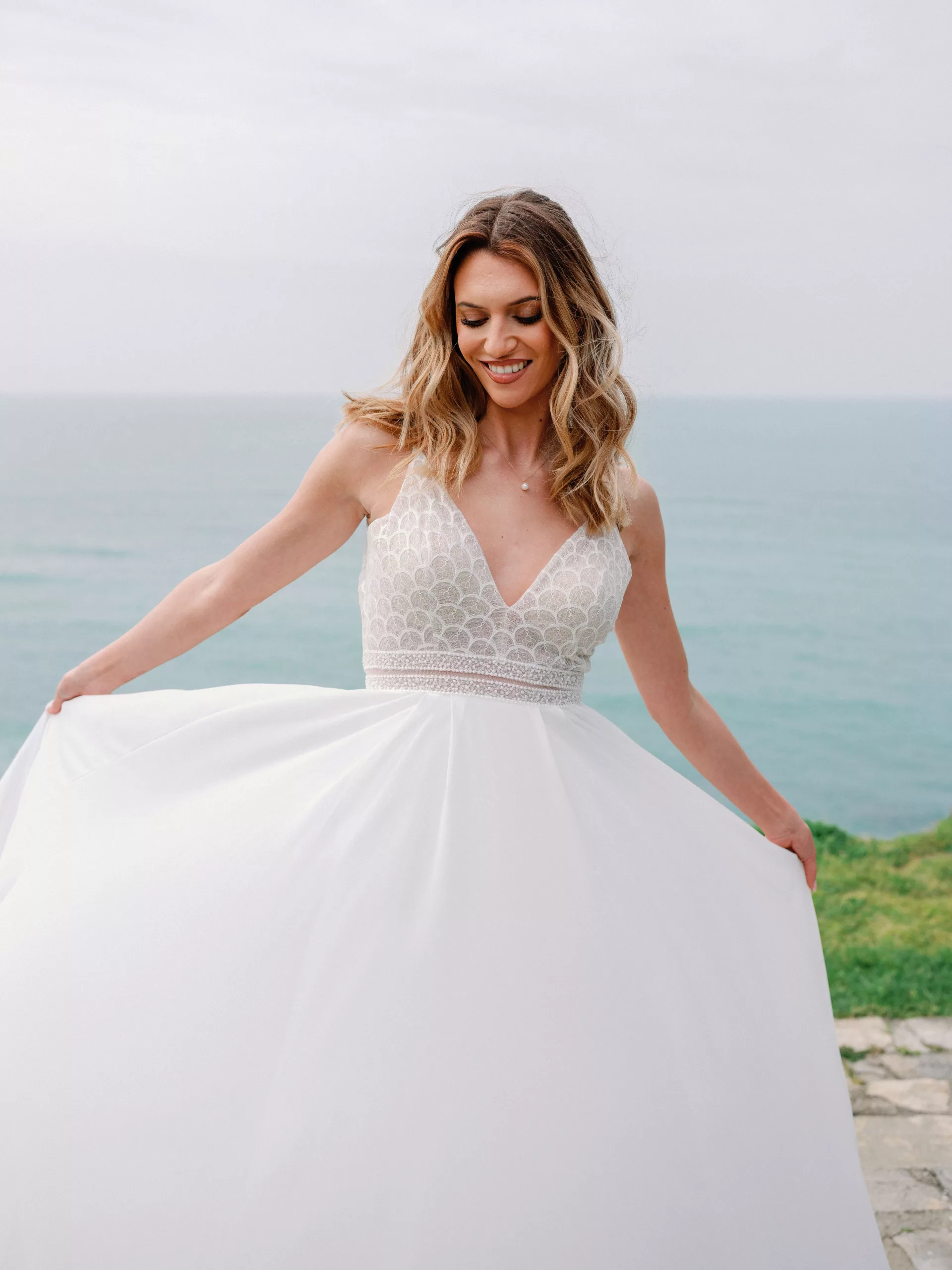 Superbe robe de la collection Angeola! Celle-ci se compose d’une dentelle légèrement brillante pour son top et de voile pour sa jupe.
