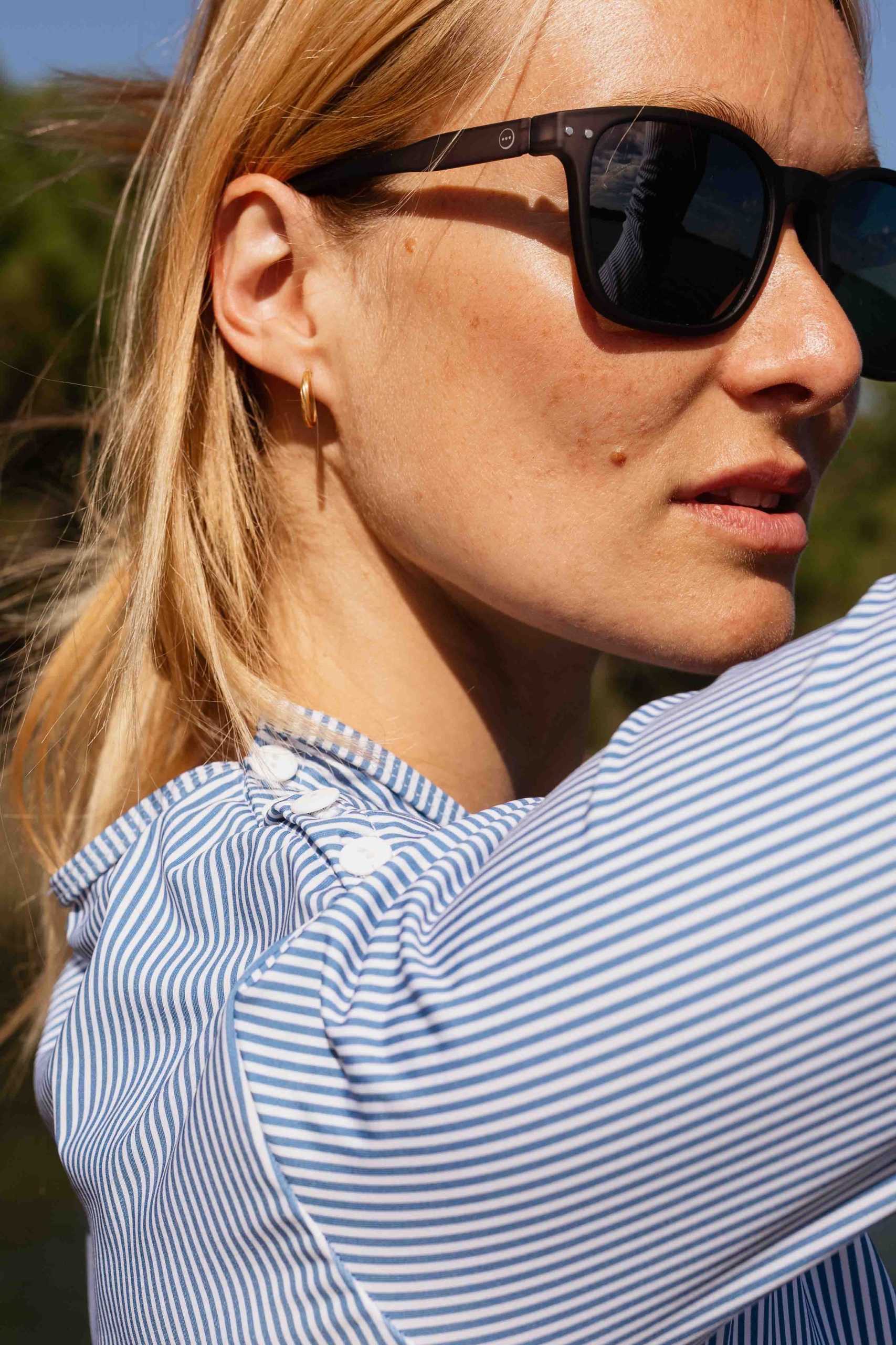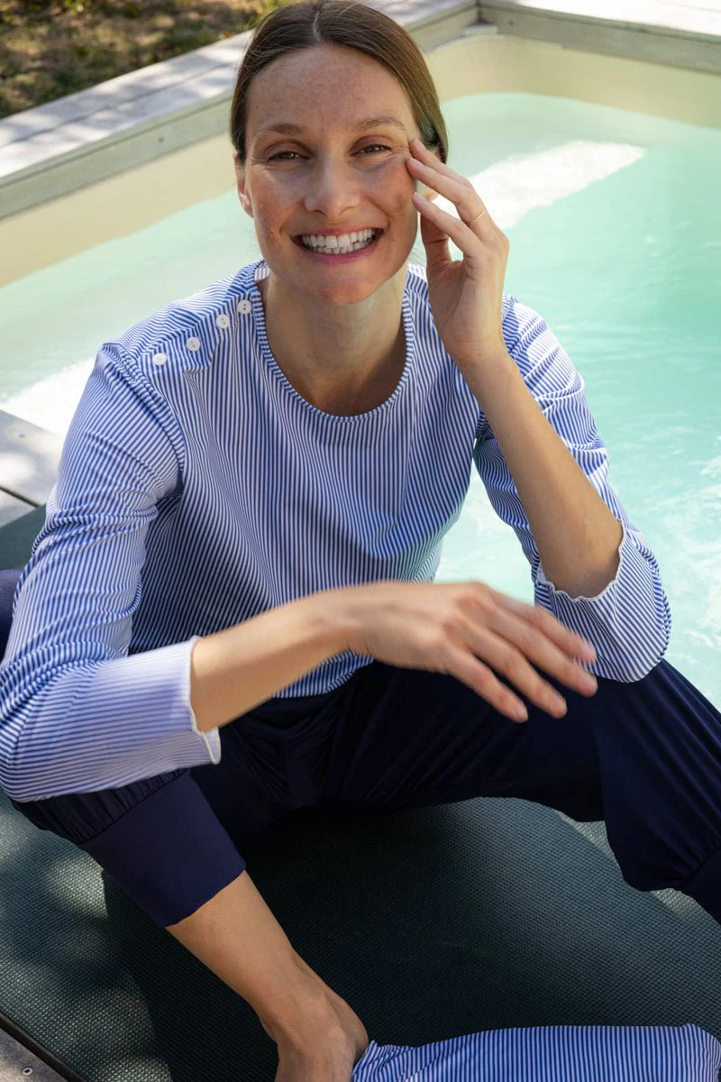 Anglet est un tee-shirt anti-UV UPF50+ manches longues inspiré de la marinière bretonne pour protéger joliment nos clientes femmes des rayons nocifs du soleil. Avec Anglet vous n’aurez pas à faire de compromis entre mode et protection solaire. À porter aussi bien en vacances qu’en ville associé à un pantalon ou une jupe, ce tee-shirt anti-UV vous protègera parfaitement au niveau du décolleté, des bras, sans oublier le ventre et le dos. Finis les coups de soleil et le stress de la crème solaire à appliquer toutes les deux heures. Ici en « summer in Biarritz » une fine rayure verticale bleue marine et blanche inspirée du « seersucker », tissu estival par excellence. À retrouver sur nos gammes homme et enfant pour un total look matchy matchy en famille. Tee-shirt vendu seul.