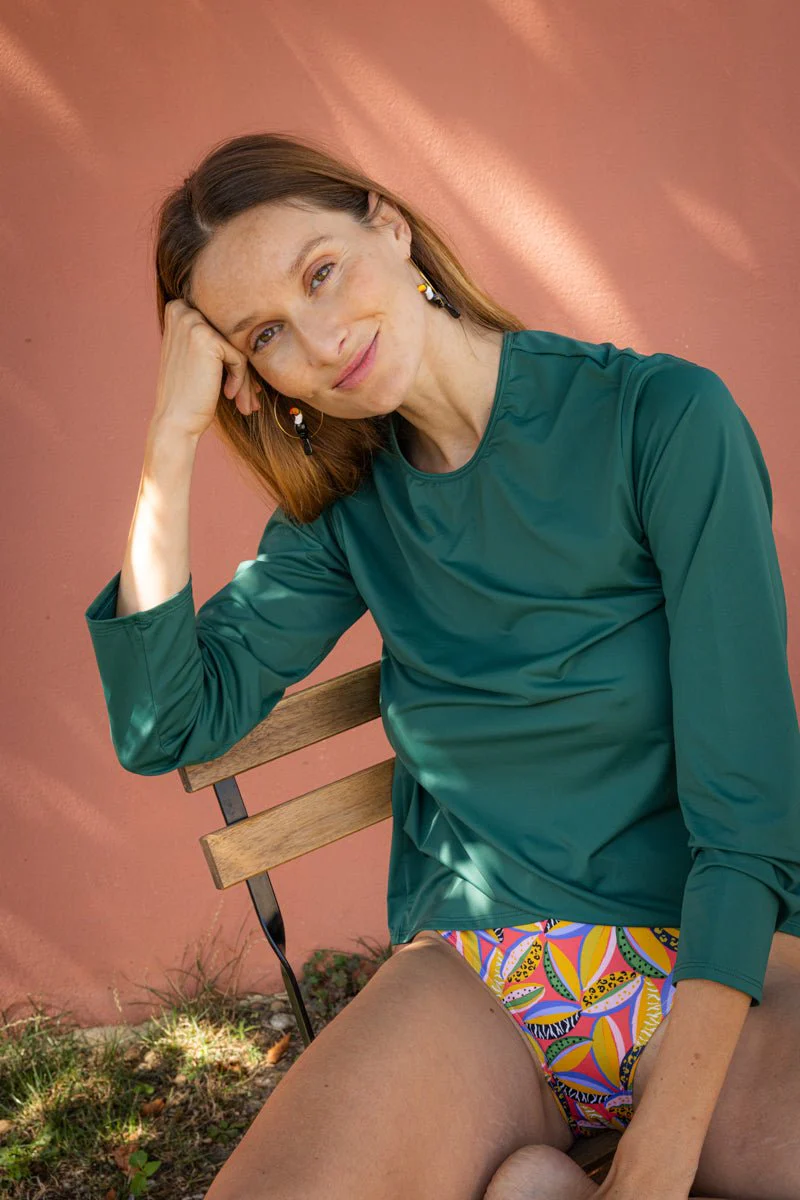 Matière seconde peau toute douce, chaleureuse et bienveillante vis à vis de vous et de la planète : 80% polyamide recyclé et 20% élasthanne. Ici en Vert pin, un coloris chic et intemporel.