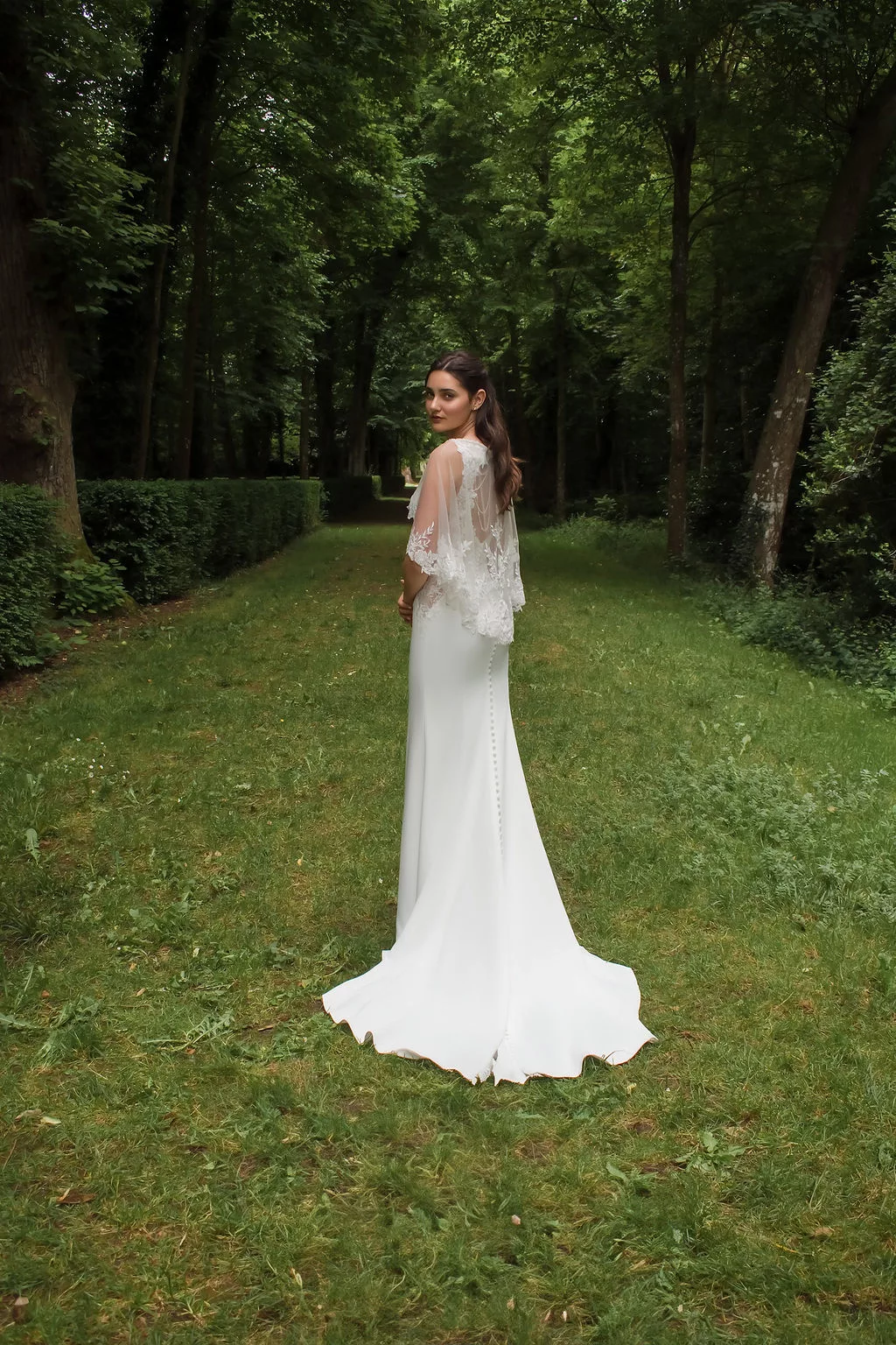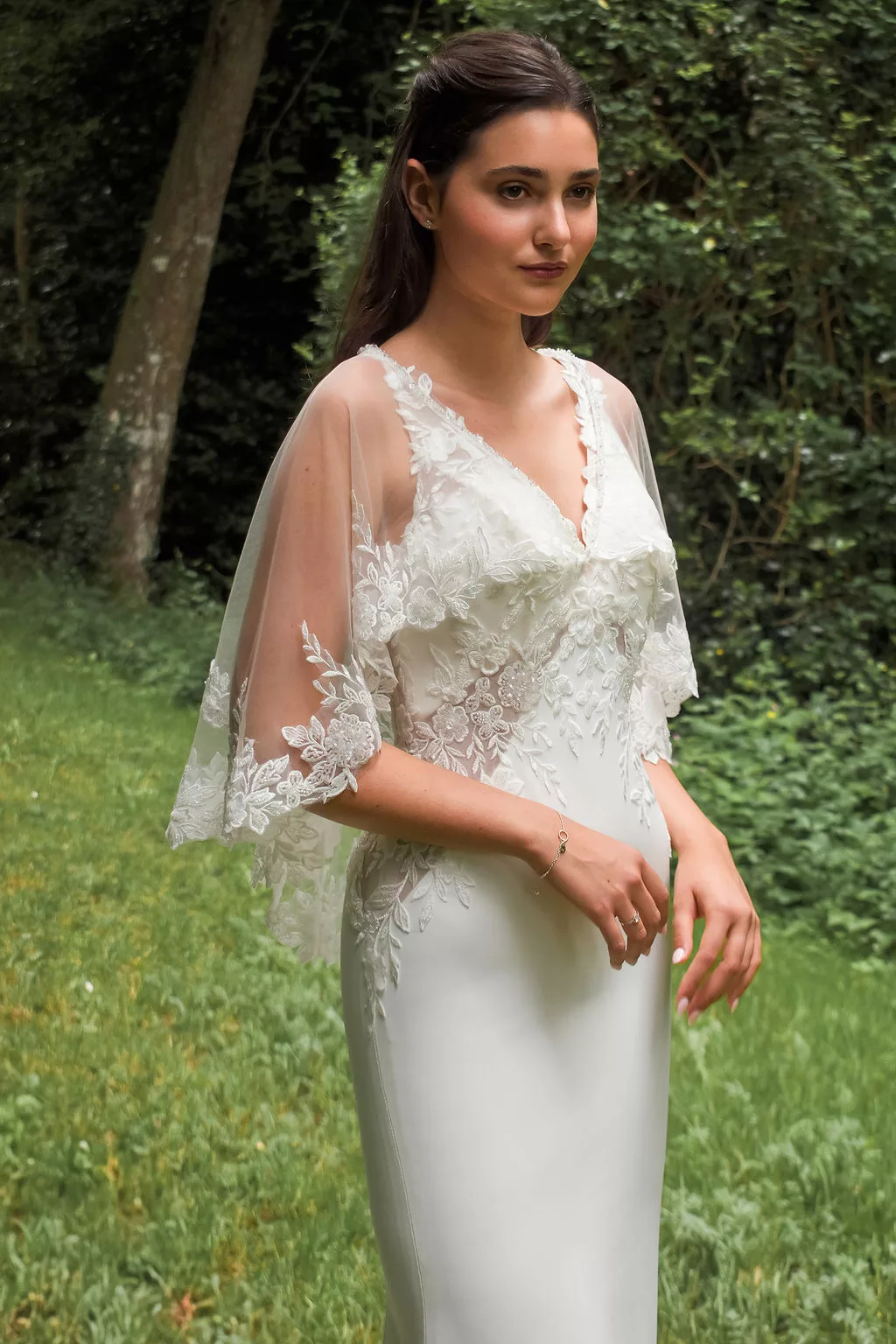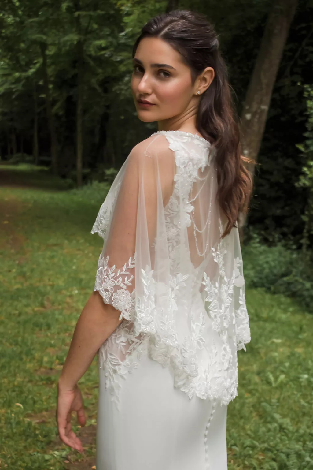 Voici une robe sirène tout à fait majestueuse! Vous allez adorer ses détails en dentelle et son dos bijoux! La petite cape est incluse.