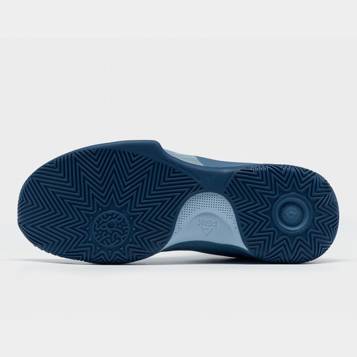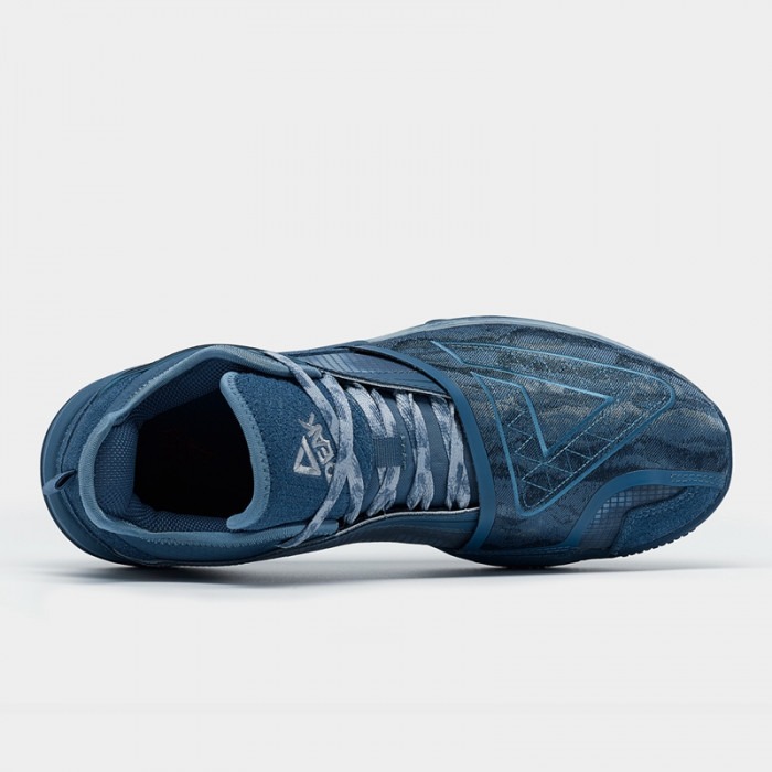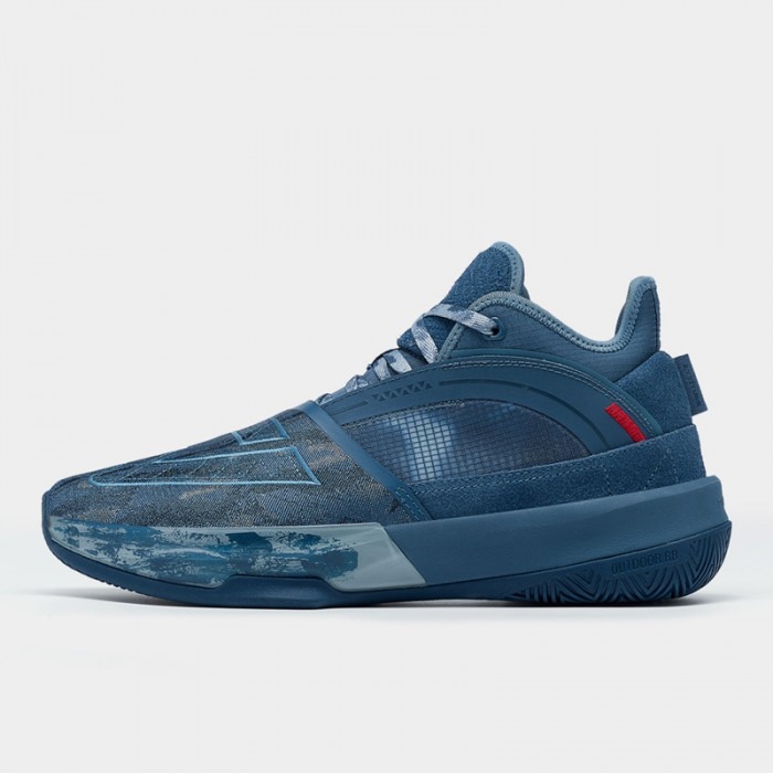 Enveloppée d’un bleu marine avec plusieurs couches de matières différentes donnant une certaine élégance à la chaussure. Les lacets ainsi que l’avant du pied sont mis en avant par un motif bleu camouflage.