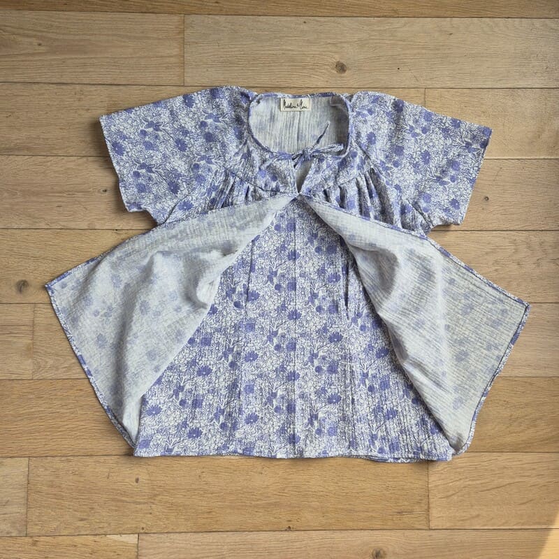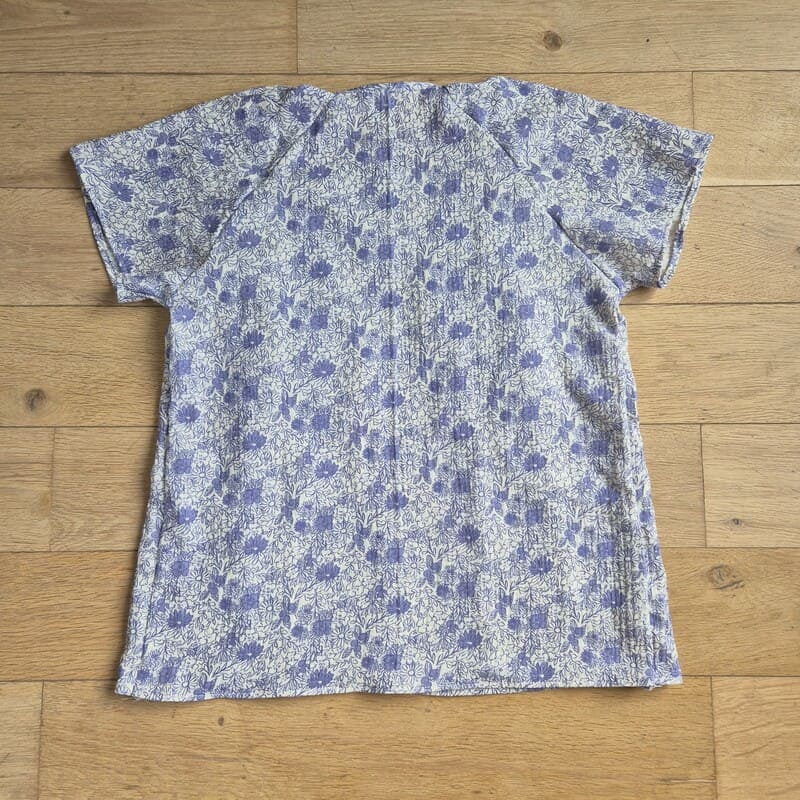 Blouse allaitement manches courtes- double gaze de coton imprimé fleurs violettes – dernière taille S