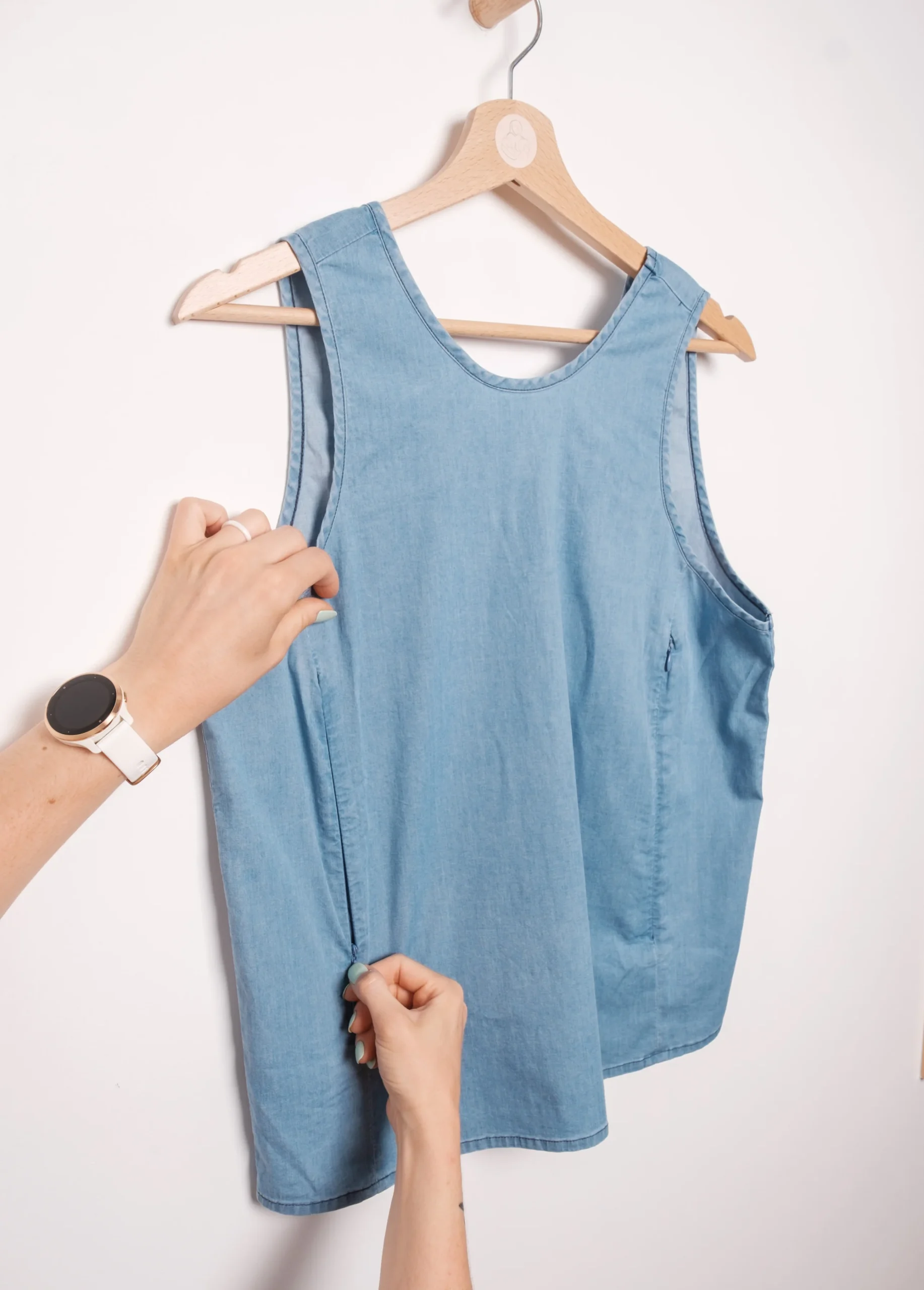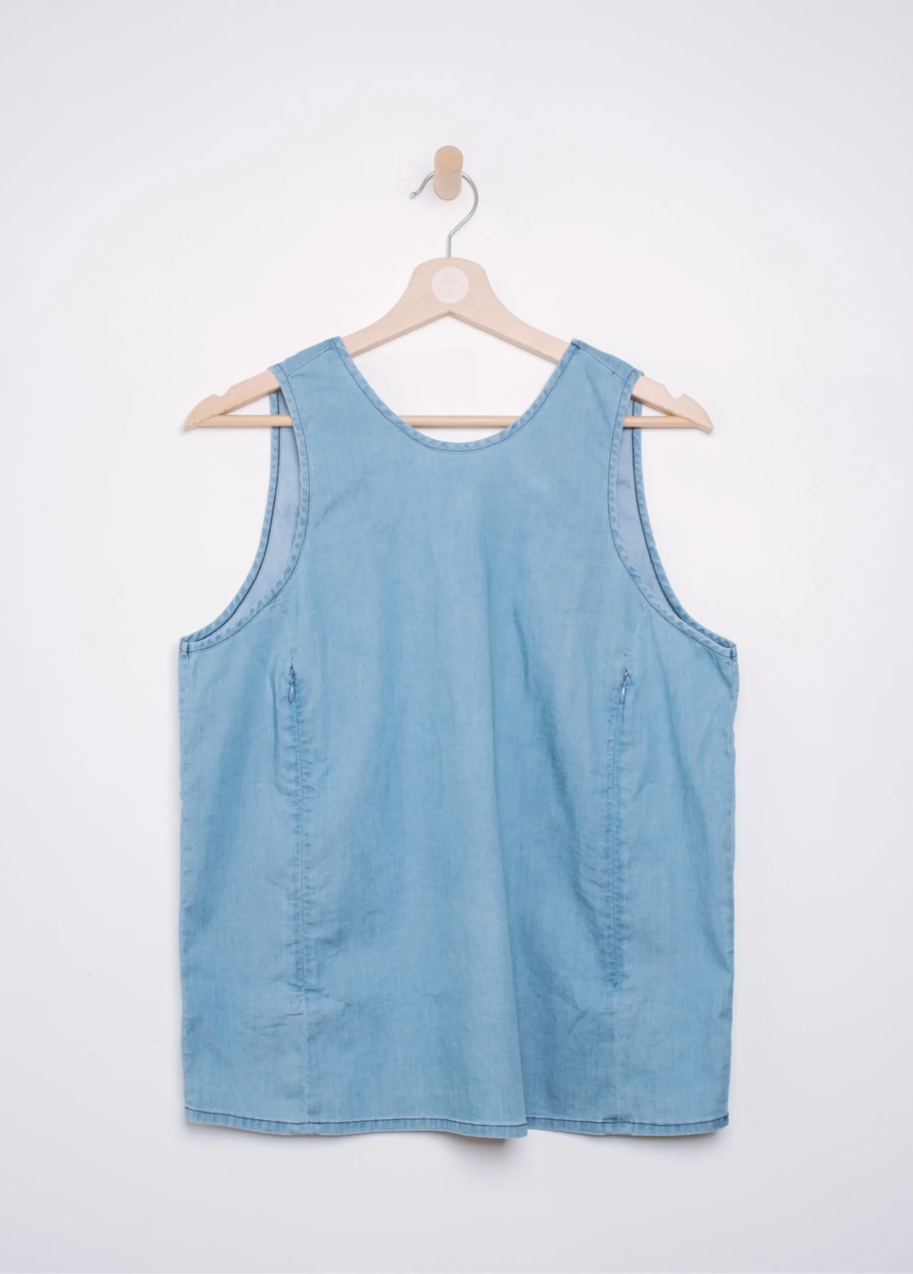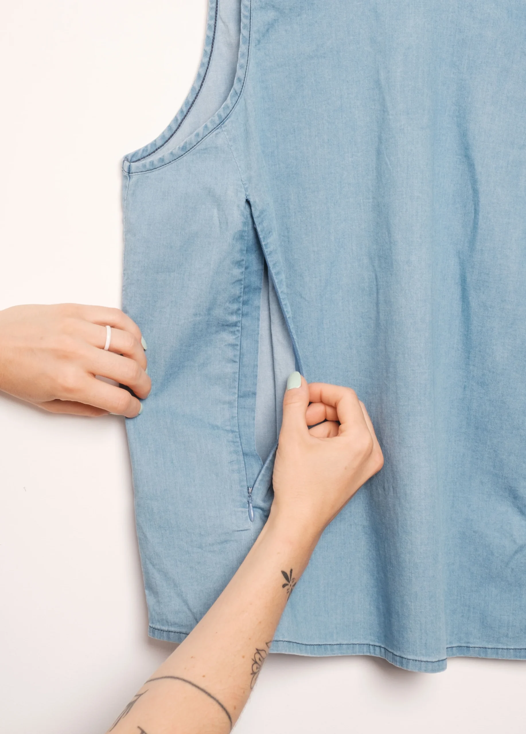 - Blouse d’allaitement sans manches, col rond, ouverture en V dans le dos.