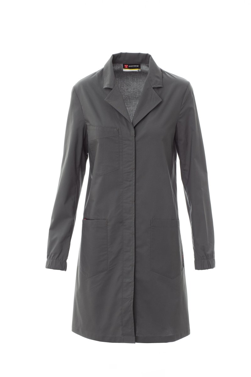 Blouse femme LAB de la marque PAYPER, avec col à revers classique, fermée sur le devant par des boutons automatiques, fermeture à boutons couverte, une poche appliquée sur la poitrine avec un compartiment porte-stylo, deux poches plaquées à la taille, une petite poche pour smartphone, empiècement dos lisse, fente à l’arrière pour faciliter les mouvements, manches longues avec élastiques serre-poignet.
