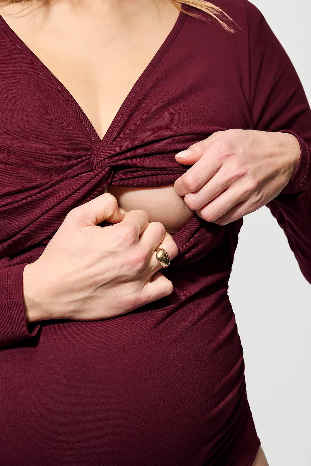 Choisir la taille du dessus Body évolutif : grossesse, allaitement et après Fronces latérales Ouverture allaitante : la partie du dessus se soulève et celle du dessous s’abaisse facilement Pressions à l’avant pour plus de facilité Tissu coton biologique