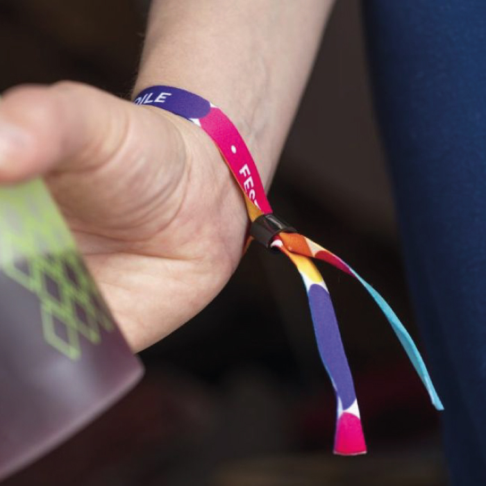 Bracelets en tissu. Format : 35 x 1,5 cm. Bague de fermeture en plastique noir. Impression en quadri recto ou recto/verso. Avec ou sans conception de la maquette.