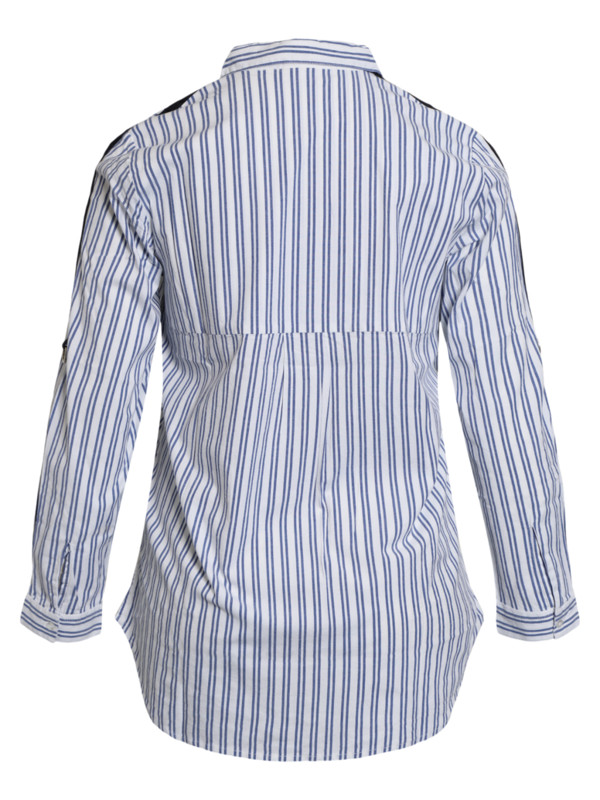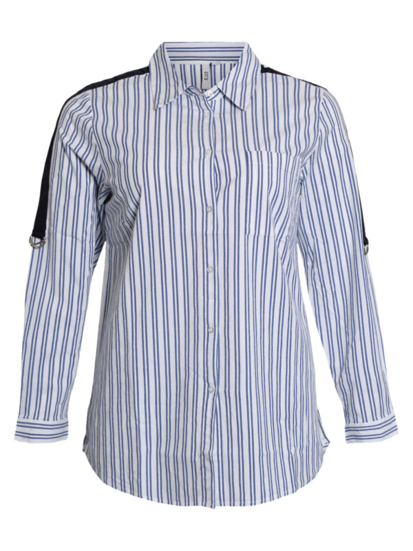 Chemise rayée à col, boutonnée sur l’avant,bande fantaisie marine sur l’épaule jusqu’au coude.