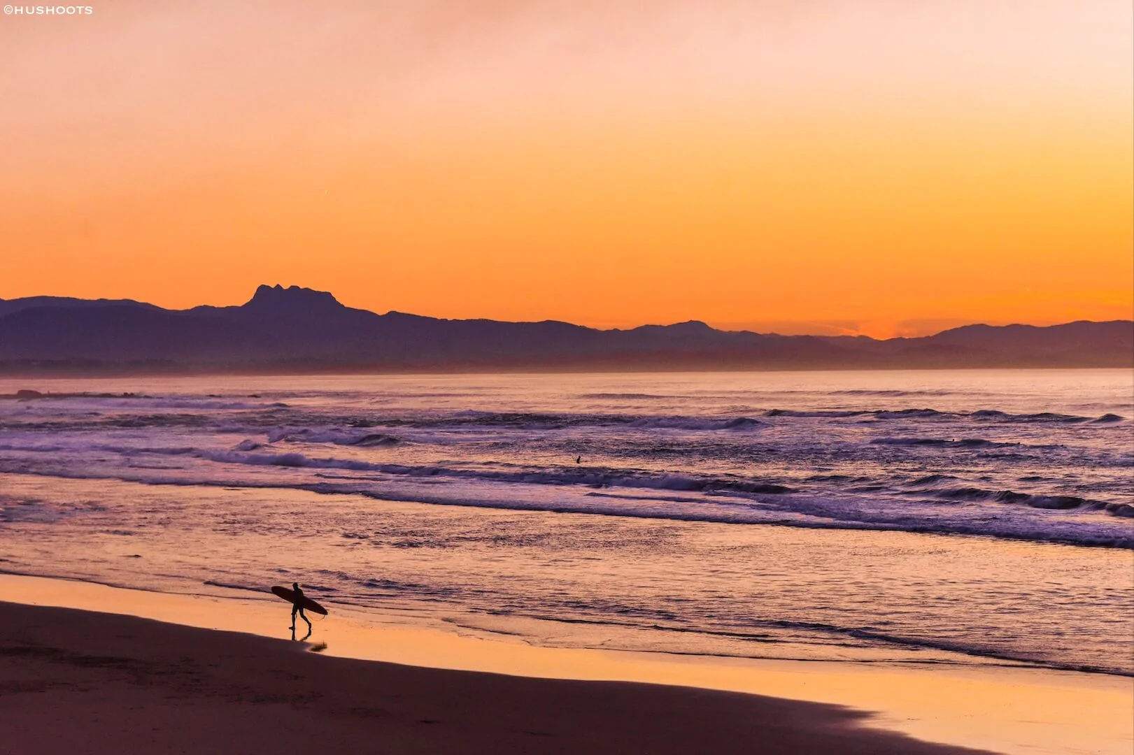 Tableau de surf : un surfeur sort de l’eau lorsque le ciel s’embrase en orange. Une magnifique fin de session avec une vue sur les Trois Couronnes.