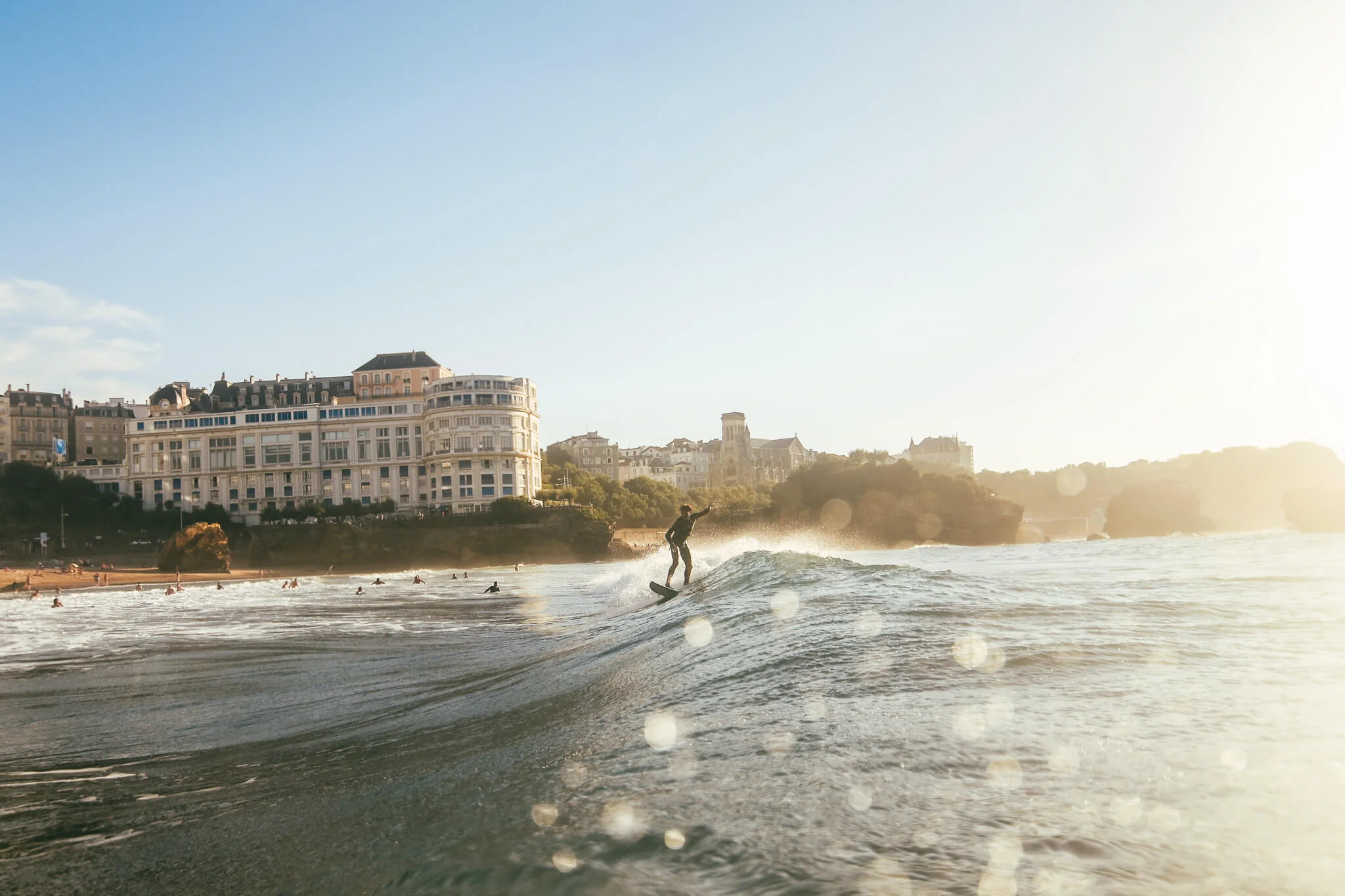 Poster de surf : Golden session dans l’Arène de la Grande Plage à Biarritz. Quand les vagues déferlent à une heure dorée.