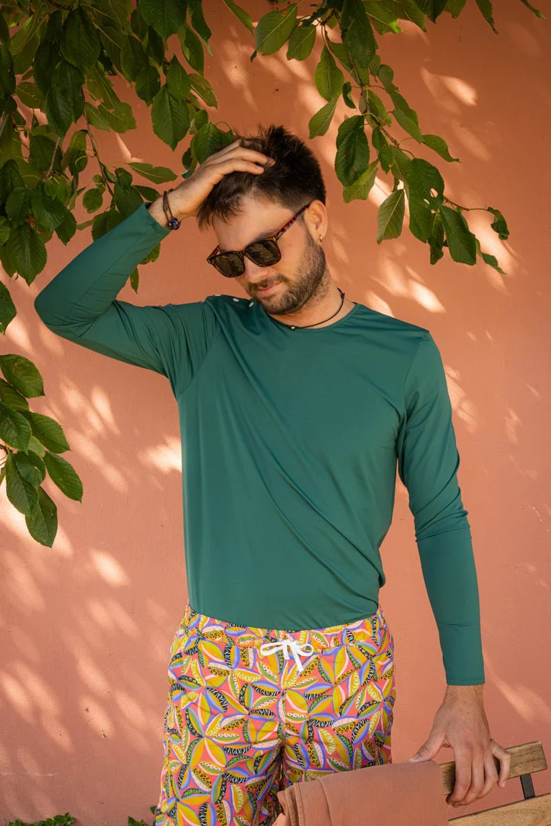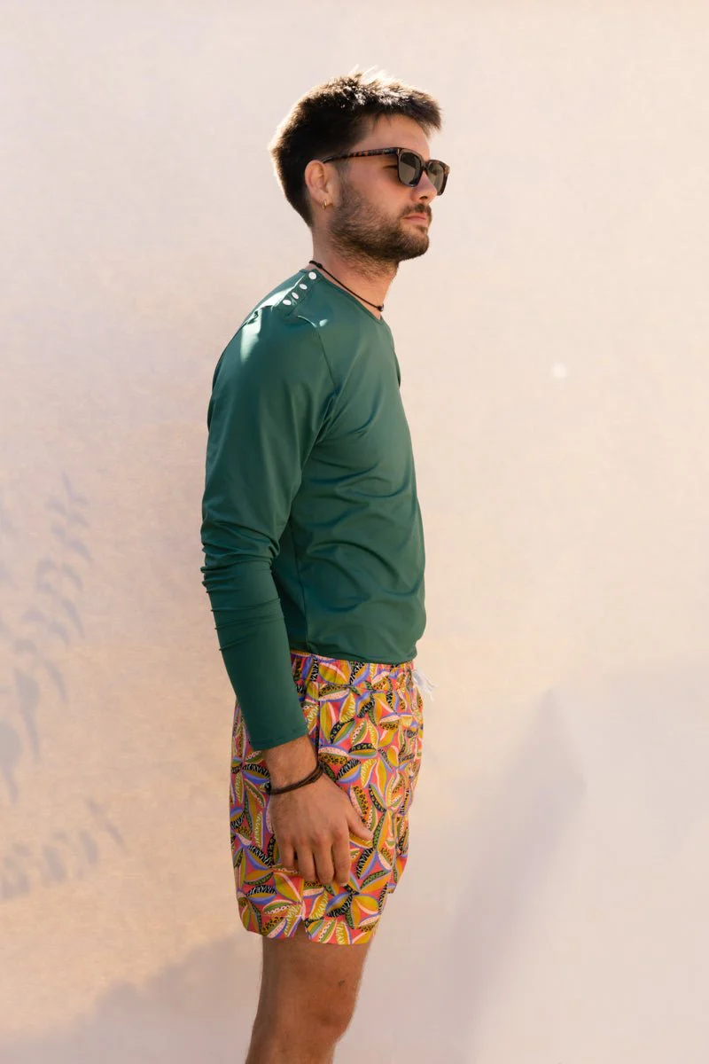 « James » c’est un short de bain anti-UV éco-conçu à partir de fibres 100% polyester recyclé et recyclable dédié à nos clients homme. Coupe à la fois classique et confortable, ceinture élastique à resserrer par un cordon, poches côté. Le short de bain James est ici proposé dans notre nouvel imprimé 2026 « Tropical ». Un imprimé inspiré […]