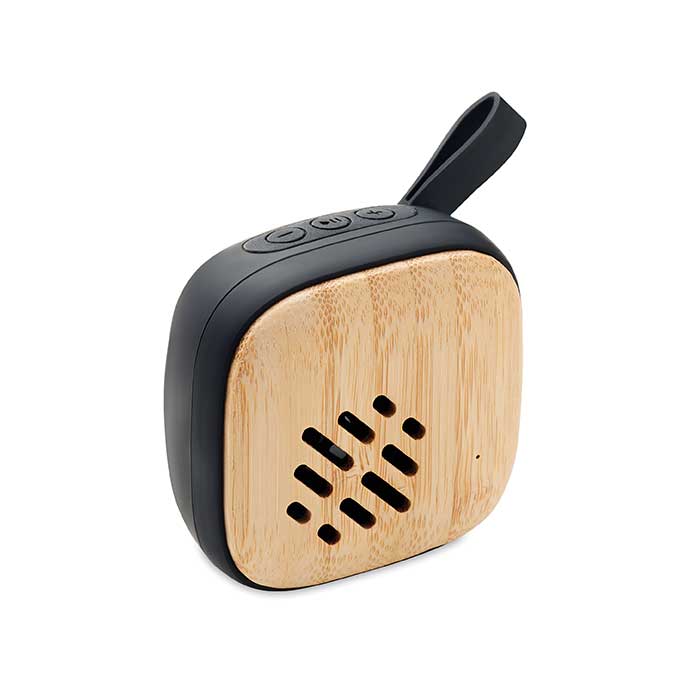 Haut-parleur sans fil 5.0 en Bambou à l’avant, ABS à l’arrière avec poignée en silicone. 1 Batterie rechargeable Li-Ion 400 mAh. Données de sortie : 3W, 4 Ohm. Durée d’écoute : environ 2h.