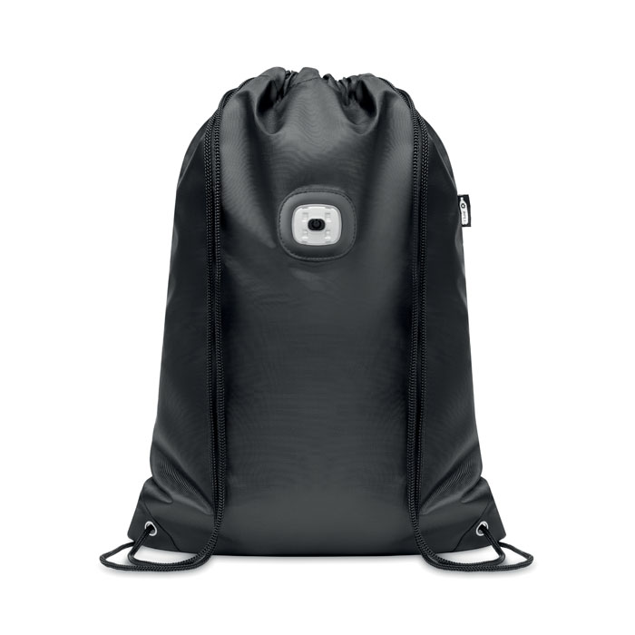 Sac à cordon en RPET 420D avec lampe amovible à l’avant. Pile bouton incluse. Lampe COB de couleur blanche et rouge.